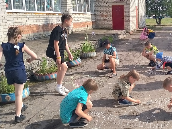 На пути они выполняли различные задания: отвечали на вопросы летней, сказочной викторины, узнали героев сказок, отгадали загадки по сказкам, поиграли в подвижные игры и рисовали на асфальте яркие краски лета.