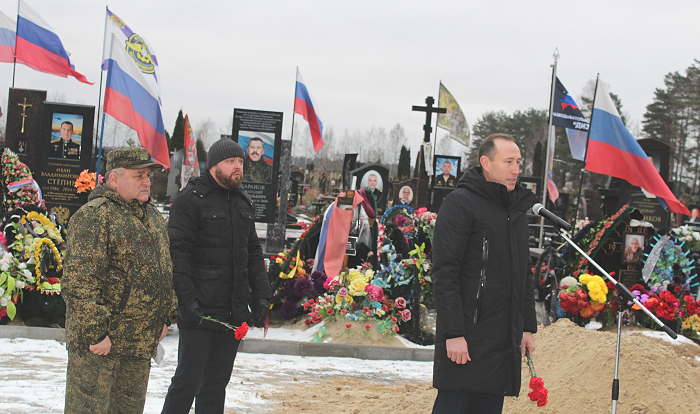 На церемонии похорон: исполняющий обязанности администрации Жуковского муниципального округа А.В.Фроловичев; заместитель директора департамента физической культуры и спорта Брянской области А.Н.Сидоров — он передал искренние слова соболезнования родным и близким погибшего от имени Правительства региона и Губернатора Брянской области. Александр Николаевич, кстати, ровесник и друг Семёна Свиридова, в одной школе учились, в Жуковке; вместе мечтали, строили планы на жизнь… И вот он провожает друга в последний путь.