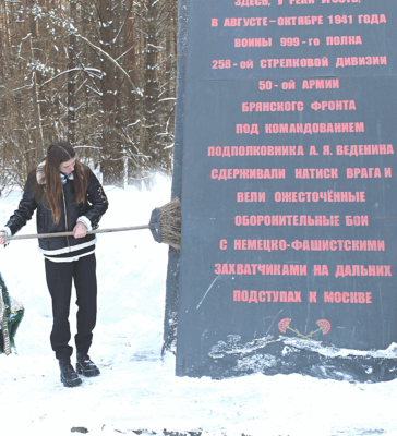 Ученики 9 – Б класса поработали организованно и слаженно у мемориала воинам 50 – й армии Брянского фронта в Летошниках. Очистили от снега площадку, ступеньки, орудия, плиту с памятной надписью…