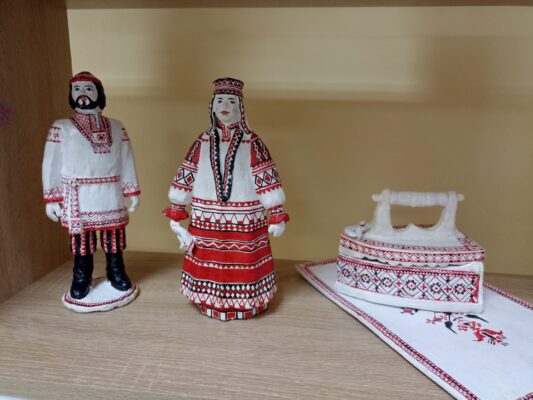 Отдельного восхищения достойны работы из керамики, в которых автор в мельчайших деталях воссоздаёт переплетения уникального орнамента рушников из разных районов Брянской области.